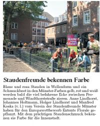 Blaue und rosa Stauden in Wellenform und ein Schmuckbeet in den Münster-Farben gelb, rot und weiß werden bald die viel befahrene Ecke zwischen Promenade und Windthorststraße zieren. Anne Lindhorst, Johannes Holtmann, Holger Lindhorst und Manfred Koska (v. l.) vom Verein der Staudenfreunde Münster haben für den Europawettbewerb Entente Florale gepflanzt. Mit dem prächtigen Staudenschmuck bekennen sie Farbe für die Innenstadt.