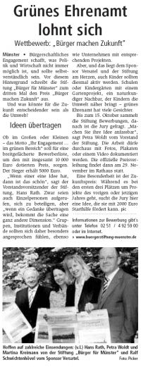 Münster - Bürgerschaftliches Engagement schafft, was Politik und Wirtschaft nicht immer möglich ist, und sollte selbstverständlich sein. Vor diesem Hintergrund schreibt die Stiftung "Bürger für Münster" zum dritten Mal den Preis "Bürger machen Zukunft" aus. Und was könnte für die Zukunft entscheidender sein als die Umwelt? Ob im Großen oder Kleinen - das Motto "Ihr Engagement ...im grünen Bereich" soll für eine breitgefächerte Bewerberliste, um den mit insgesamt 10 000 Euro dotierten Preis, sorgen. Der Sieger erhält 5000 Euro. "Wenn einer eine Idee hat, dann ist das schön", sagt der Vorstandsvorsitzender der Stiftung, Hans Rath.
