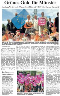 Sieg beim Wettbewerb „Unsere Stadt blüht auf“ / 2007 folgt Europa-Entscheid Von Maria Meik Münster. Gold! Gold! Gold! Münster ist seit gestern im Goldrausch – und Erich Welling hat eine Fahne. Nicht irgendeine, sondern die Europafahne! Im ZDF-Fernsehgarten in Mainz hatte Münster die Nase vorn beim Bundeswettbewerb „Unsere Stadt blüht auf“. Die lebenswerteste Stadt der Welt überzeugte die Jury und holte nicht nur Gold, sondern setzte noch einen drauf, indem sie sich im nächsten Jahr mit zwölf Städten beim Europawettbewerb „Entente Florale“ messen darf.