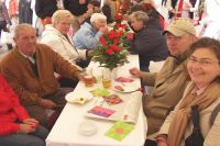 Gutgelaunt präsentieren Stadtdirektor Hartwig Schultheiß und Fritz Schmücker von Münster Marketing die neuen bunten Postkarten für alle Farbenbekenner aus Münster oder die, die es noch werden wollen. Die sechs knalligen Motive schmücken neben roten Blumen als kleine Farbtupfer die blütenweiße Tischdecke der 100 Meter langen Hansetafel. Besucher und Bewohner Münsters sind eingeladen, vor historischer Kulisse Platz zu nehmen und den Tag in Münster zu genießen. Auch 30 Fahnen in den Stadtfarben Weiß, Rot und Gelb bringen Farbe ins Spiel. Sie schmücken die Giebelhäuser und sorgen für eine bunte Kulisse. Die Fahnen sind Eigentum der Kaufmannschaft und werden immer zu besonderen Anlässen auf dem Prinzipalmarkt ausgehängt.