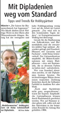Tipps und Trends für Hobbygärtner Münster - „Die Saison für Blumenschmuck hat begonnen!“ Wie Musik dürften Erich Wellings Worte in den Ohren aller Pflanzenfreunde klingen. Bislang hat der verregnete und kalte Frühlingsanfang wenig Lust auf die Arbeit im Garten gemacht. „Das wird sich in den kommenden Tagen ändern“, ist Kreisgärtnermeister Welling fest überzeugt. Gerade für die Bepflanzung von Balkonkästen und Blumenkübeln sind die erwarteten milden Tage optimal. „Besonders gefragt sind Standard-Pflanzen wie Geranien und Fuchsien“, weiß Heinz Schrieverhoff. Der Gärtnereibesitzer empfiehlt, die Blüten-Kombinationen mit reinen Blattpflanzen – etwa mit Buntnesseln, die in diversen Farben zu haben sind – aufzulockern.