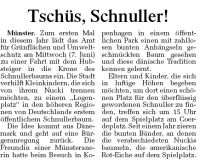 Münster. Zum ersten Mal in diesem Jahr lädt das Amt für Grünflächen und Umweltschutz am Mittwoch (7. Juni) zu einer Fahrt mit dem Hubsteiger in die Krone des Schnullerbaums ein. Die Stadt verhilft Kleinkindern, die sich von ihrem Nucki trennen möchten, zu einem „Logenplatz“ in den höheren Regionen von Deutschlands erstem öffentlichem Schnullerbaum.Die Idee kommt aus Dänemark und geht auf eine Bürgeranregung zurück. Die Freundin einer Münsteranerin hatte beim Besuch in Kopenhagen in einem öffentlichen Park einen mit zahllosen bunten Anhängseln geschmückten Baum gesehen und diese dänische Tradition kennen gelernt. Eltern und Kinder, die sich in luftige Höhen begeben möchten, um dort einen schönen Platz für den überflüssig gewordenen Schnuller zu finden, treffen sich um 15 Uhr auf dem Spielplatz am Coerdeplatz. Seit einem Jahr zieren die bunten Bänder, an denen die verabschiedeten Nuckis baumeln, die amerikanische Rot-Eiche auf dem Spielplatz.