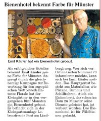 Als erfolgreicher Hotelier bekennt Emil Käufer gerne Farbe für Münster. Angeregt durch die gleichnamige Kampagne zur Bewerbung für den europäischen Wettbewerb Entente Florale hat der Kleingärtner in den vergangenen fünf Monaten ein Bienenhotel gebaut.