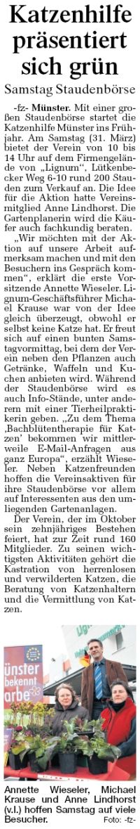 -fz- Münster. Mit einer großen Staudenbörse startet die Katzenhilfe Münster ins Frühjahr. Am Samstag (31. März) bietet der Verein von 10 bis 14 Uhr auf dem Firmengelände von "Lignum", Lütkenbecker Weg 6-10 rund 200 Stauden zum Verkauf an. Die Idee für die Aktion hatte Vereinsmitglied Anne Lindhorst. Die Gartenplanerin wird die Käufer auch fachkundig beraten. "Wir möchten mit der Aktion auf unsere Arbeit aufmerksam machen und mit den Besuchern ins Gespräch kommen", erklärt die erste Vorsitzende Annette Wieseler. Lignum- Geschäftsführer Michael Krause war von der Idee gleich überzeugt, obwohl er selbst keine Katze hat. Er freut sich auf einen bunten Samstagvormittag, bei dem der Verein neben den Pflanzen auch Getränke, Waffeln und Kuchen anbieten wird. Während der Staudenbörse wird es auch Info-Stände, unter anderem mit einer Tierheilpraktikerin geben. "Zu dem Thema ‚Bachblütentherapie für Katzen’ bekommen wir mittlerweile E-Mail-Anfragen aus ganz Europa", erzählt Wieseler. Neben Katzenfreunden hoffen die Vereinsaktiven für ihre Staudenbörse vor allem auf Interessenten aus den umliegenden Gartenanlagen. Der Verein, der im Oktober sein zehnjähriges Bestehen feiert, hat zurzeit rund 160 Mitglieder. Zu seinen wichtigsten Aktivitäten gehört die Kastration von herrenlosen und verwilderten Katzen, die Beratung von Katzenhaltern und die Vermittlung von Katzen.
