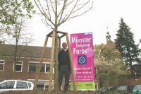 Orkan Kyrill hat an der Königsstraße ein Naturdenkmal zerstört. Eine alte Kastanie fiel dem Orkan zum Opfer. Jetzt steht dort ein neuer stattlicher Baum. Die Baumschule Niederbeckmann ersetzte an dieser Stelle den auseinander gebrochenen alten Baum durch ein neues großes Exemplar einer weißblütigen Kastanie. Dieser Baum mit einem Umfang von fast 40 Zentimetern und einem Alter von rund 28 Jahren wird das Hochbeet am Parkplatz an der Königsstraße schon bald wieder beschatten. Damit er einen guten Start am neuen Standort hat, wurde der alte Wurzelstock vollständig ausgefräst und neue Erde aufgefüllt. Auf dem Bild sieht man den "Farbenbekenner" Hermann Niederbeckmann, Chef der gleichnamigen Baumschule in Münster.