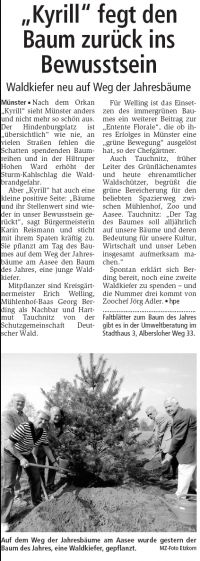 Mitpflanzer sind Kreisgärtnermeister Erich Welling, Mühlenhof-Baas Georg Berding als Nachbar und Hartmut Tauchnitz von der Schutzgemeinschaft Deutscher Wald. Für Welling ist das Einsetzen des immergrünen Baumes ein weiterer Beitrag zur "Entente Florale", die ob ihres Erfolges in Münster eine "grüne Bewegung" ausgelöst hat, so der Chefgärtner. Auch Tauchnitz, früher Leiter des Grünflächenamtes und heute ehrenamtlicher Waldschützer, begrüßt die grüne Bereicherung für den beliebten Spazierweg zwischen Mühlenhof, Zoo und Aasee. Tauchnitz: "Der Tag des Baumes soll alljährlich auf unsere Bäume und deren Bedeutung für unsere Kultur, Wirtschaft und unser Leben insgesamt aufmerksam machen." Spontan erklärt sich Berding bereit, noch eine zweite Waldkiefer zu spenden - und die Nummer drei kommt von Zoochef Jörg Adler. Faltblätter zum Baum des Jahres gibt es in der Umweltberatung im Stadthaus 3, Albersloher Weg 33. |