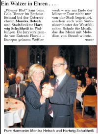 "Wiener Blut" kam beim Gala-Dinner im Rathausfestsaal bei der Österreicherin Monika Hetsch und Stadtdirektor Hartwig Schultheiß in Wallungen. Die Juryvorsitzende von Entente Florale - Europas grünem Wettbewerb - war am Ende der Münster-Tour nicht nur von der Stadt begeistert, sondern auch vom Sinfonieorchester der Westfälischen Schule für Musik, das das Menü mit Melodien von Strauß würzte. -mm-