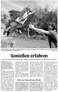 Die Natur-Genuss-Route ist eine Auswahl von Radwegen rund um Münster. Das Radwegnetz ist 160 Kilometer lang. Alle Wege führen zu mehr als 80 Regionalvermarktern, also Hofläden, Gaststätten oder Bauernhöfen, und an 22 Naturschutzgebieten vorbei. Die Routen können in GPS-Geräte geladen werden. Rund um die Natur- Genuss-Route werden das ganze Jahr Thementouren vom NABU angeboten. Der Kartensatz mit Nord- und Südkarte kostet sechs Euro und ist ab nächster Woche im Buchhandel erhältlich. |