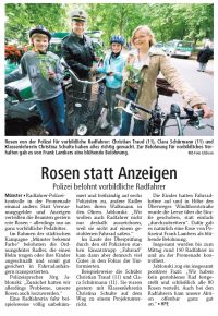 Polizei belohnt vorbildliche Radfahrer Von Helmut Peter Etzkorn Münster - Radfahrer-Polizeikontrolle in der Promenade einmal anders: Statt Verwarnungsgelder und Anzeigen verteilten die Beamten gestern rote Rosen – allerdings nur an ganz vorbildliche Pedalritter. Im Rahmen der städtischen Kampagne „Münster bekennt Farbe“ belohnten die Ordnungshüter Radler, die einen Helm trugen oder ihre Kinder angeschnallt und somit gut gesichert in Fahrradanhängern transportierten. Polizeisprecher Jörg Jablonski: „Zunächst hatten wir allerdings Probleme, unsere Rosen auch loszuwerden.“