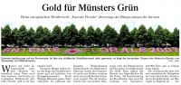 Von Günter Benning Wenn’s um mehr Lebensqualität geht, holt Münster bekanntlich einen Preis nach dem anderen. Auch beim europäischen Wettbewerb "Entente Florale" gibt es im September Gold. Tausende Bürger haben unter der Regie des Grünflächenamtes und auf Initiative von Kreisgärtnermeister Erich Welling Münsters grüne Seite aufpoliert. Sie pflanzen den längsten Blumenkasten Deutschlands im Mühlenhof- Museum, lassen die Promenade nicht nur blühen, sondern auch zur musikalischen Grünzone werden. Was die internationale Jury am meisten überzeugt, sind der Bürgereinsatz und das grüne Gesamtkonzept der Stadt. Dazu zählen der Einsatz von Jugendlichen für die Natur, die Renaturierung der Rieselfelder, aber auch die Leistung von Sponsoren. 160 000 Euro gab es binnen eines Jahres. Die Goldmedaille holt sich eine münsterische Delegation bei einer feierlichen Zeremonie in der Kathedrale von Harrogate in England ab.