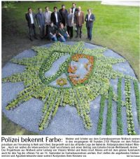 Meister und Schüler aus dem Gartenbauzentrum Wolbeck setzten in den vergangenen 48 Stunden 2150 Pflanzen vor dem Polizeipräsidium am Friesenring in Reih und Glied. Dargestellt wird das offizielle Logo der Behörde. Polizeipräsident Hubert Wimber: "Auch wir wollen die lebenswerteste Stadt verschönern und einen Beitrag zum Entente Florale Wettbewerb leisten." Das Projektteam aus Wolbeck unter Leitung von Vinzenz Winter und Heinz Josef Ahrens will mit dem grünen Kunstwerk auch für den Tag der offenen Tür am 16. September im Gartenbauzentrum werben. Dort stellen die angehenden Gärtnermeister und Agrarbetriebswirte dann weitere Kostproben ihres Könnens vor.