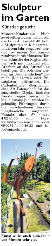 Münster-Kinderhaus. Nach zwei erfolgreichen Jahren soll das Projekt "Kunst trifft Kohl - Skulpturen in Kleingärten" in diesem Jahr ausgebaut werden zu einem Skulpturenrundweg durch Münsters Norden. Künstler der Region können sich mit maximal zehn Arbeiten an der Ausstellung beteiligen. Die Arbeiten werden im "teilöffentlichen" Bereich (Kleingärten oder Privatgärten) präsentiert. Die Gartenbesitzer übernehmen eine Art Patenschaft für das ausgestellte Objekt. Nach der Ausstellungseröffnung Ende Mai / Anfang Juni werden regelmäßig Führungen durch die verschiedenen Ausstellungsbereiche angeboten. Kontakt über 0251 / 4 92 41 50 und