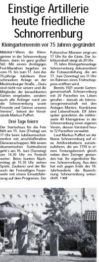 Von Christoph Walter Münster - Wenn die Kleingärtner in der Schnorrenburg feiern, dann im ganz großen Stil: Mit einem dreitägigen Fest Marathon begehen sie vom 15. bis zum 17. Juni das 75jährige Jubiläum ihrer schmucken Anlage an der Mecklenburger Straße. "Dazu sind nicht nur unsere und die Mitglieder der benachbarten Gärten eingeladen, sondern auch alle Anlieger rund um die Schnorrenburg sowie Freunde und Gönner unseres Vereins" , betont der Vorsitzende Markus Puffert. Der Startschuss für die Fete fällt am 15. Juni (Freitag) um 17 Uhr beim Jubiläumsschützenfest mit anschließendem Dämmerschoppen.