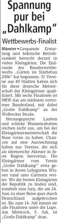Wettbewerbs-Finalist Münster K Gespannte Erwartung und hektische Betriebsamkeit herrscht derzeit in vielen Kleingärten: Die Endrunde des Bundeswettbewerbs „Gärten im Städtebau 2006“ hat begonnen. 51 Vereine aus 49 Städten haben sich für diese deutsche Meisterschaft der Kleingärtner qualifiziert. Mit sechs Finalisten ist NRW das am stärksten vertretene Bundesland, mit dabei „Große Dahlkamp“ an der Wolbecker Straße. Herausgeputzte Lauben und schicke Blumenrabatten reichen nicht aus, um bei der Kleingärtnermeisterschaft die Nase vorne zu haben. Chancen auf eine Auszeichnung haben nur Vereine, die sich als ideenreiche Akteure in ihrer Region hervortun. Die Kleingärtner vom Verein „Große Dahlkamp“ etwa geben in ihrem Lehrgarten Wissen rund ums Gärtnern weiter. Wo die besten Kleingärten der Republik zu finden sind, ermittelt eine Jury, die am 24. Juni zu einer Reise quer durch Deutschland aufgebrochen ist. Bis zum 14. Juli nimmt sie alle Finalisten unter die Lupe. Am Mittwoch, 5. Juli, ist „Große Dahlkamp“ dran.