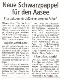 Pflanzaktion für "Münster bekennt Farbe“ Münster. Am "Tag des Baumes" am 25. April wird der "Weg der Jahresbäume" an Münsters Aasee um eine junge Schwarzpappel erweitert. Der Grund: Die Schwarzpappel ist zum "Baum des Jahres 2006" bestimmt worden. Weg der Jahresbäume Vor vier Jahren hat das Amt für Grünflächen und Umweltschutz der Stadt den "Weg der Jahresbäume" am Aasee angelegt, um die Bedeutung der Jahresbäume stärker ins öffentliche Bewusstsein zu rücken.