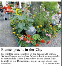 So prächtig kann es mitten in der Innenstadt blühen: Sonnenblumen und andere farbenfrohe Sommergewächse verwandeln dieses Blumenbeet neben einem Straßencafé an der Dominikanerkirche in eine kleine Sommerwiese.