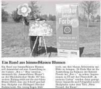 Ein Band aus himmelblauen Blumen soll demnächst auf eine Ausstellung in der Galerie "flos c." (flos ceruleus, lateinisch für "himmelblaue Blume") an der Mecklenbecker Straße 387 hinweisen. Bislang steht erst die eine blaue Blume (Bild), eine aus Schrott geschaffene Skulptur von Hildegard Strecker Radzieowski. Ein wenig Regen fehlt noch, um ihre blauen Schwestern zur Blüte zu bringen. Ab Ende Mai ist die Ausstellung im Rahmen der Entente Florale bei "flos c." zu sehen. Impressionen in Öl mit der Überschrift "In meinem Garten" werden dann gezeigt, ferner Aquarelle und Fotografien sowie Skulpturen unter dem Titel "Mein Freund, der Baum".