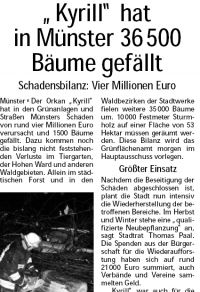Nachdem die Beseitigung der Schäden abgeschlossen ist, plant die Stadt nun intensiv die Wiederherstellung der betroffenen Bereiche. Im Herbst und Winter stehe eine "qualifizierte Neubepflanzung" an, sagt Stadtrat Thomas Paal. Die Spenden aus der Bürgerschaft für die Wiederaufforstung haben sich auf rund 21 000 Euro summiert, auch Verbände und Vereine sammelten Geld. "Kyrill" war auch für die Feuerwehr Münster das größte Ereignis ihres Bestehens. Vom 18. bis 20. Januar kam es in der Stadt zu mehr als 1000 Alarmen. Hpe |