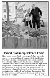 Eine runde zehn Quadratmeter große Baumscheibe direkt vor seinem Einrichtungsgeschäft hat Herbert Stallkamp zu einer grünen Oase umgewandelt. Buchsbaum, Rotkohl, Bodendeckende Rosen und Stauden zieren seit kurzem die mit einer Holzpalisade eingefasste Baumscheibe an der Studtstraße. Die Stadt – vertreten durch Wolfram Goldbeck (l.) vom Grünflächenamt – begrüßt die Aktion des Kreuzviertlers ausdrücklich und hofft auf weitere Nachahmer. Die Kosten müssen die Begrüner allerdings selber tragen. Ebenso die Pflege. |