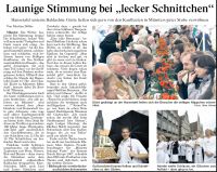 Dass es den Gästen gefiel, bemerkte auch Arkaden-Manager Matthias Bormann. "Die sitzen und klönen", stellte er fest. Und sorgte für Umsatz: "Wenn Sie noch bleiben, dann möchten Sie bestimmt noch ein Häppchen..?" Keine Frage, wer kann da schon Nein sagen? Bestätigende Stimmen der Gästeschar: "Ich mach schon das zweite Mal beim Stadtbummel hier Station", sagte Ludger Mentrup, der Ehefrau Heidi zuprostet. Am Nebentisch sitzt eine Radlertruppe, die "so was Tolles" noch nie erlebt hat. Farbe auf die Tische brachten nicht nur leuchtende Blumen: Marc Endres, Projektbeauftragter für "Münster bekennt Farbe" der Entente florale Europe 2007, schenkte dem OB bunte Postkarten zum Thema und dekorierte auch die weißen Decken. |