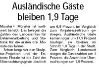 Münster - Münster ist weltweit beliebt. Das belegen die Zahlen des Landesamtes für Datenverarbeitung und Statistik für die ersten drei Monate des Jahres. Schon lange vor den Skulptur-Projekten und der Entente Florale ist die Zahl der Übernachtungsgäste deutlich um 6,9 Prozent im Vergleich zum Vorjahreszeitraum gestiegen. Ausländische Gäste kamen sogar um 17,9 Prozent häufiger, sie blieben im Schnitt 1,9 Tage in der Stadt. Zum Vergleich: Landesweit stiegen die Gästezahlen um 3 Prozent, die Anzahl der Übernachtungen um 1,9 Prozent.