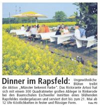 Ungewöhnliche Blüten treibt die Aktion „Münster bekennt Farbe“. Das Ristorante Artusi hat sich mit einem 300 Quadratmeter großen Ableger in Rinkerode bei den Baumschulen Eschweiler inmitten eines blühenden Rapsfeldes niedergelassen und serviert dort bis zum 21. Mai ab 12 Uhr Köstlichkeiten in fester und flüssiger Form.