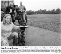 müssen die Wildblumenwiesen, die Landwirte und Jäger an zahlreichen stillgelegten ehemaligen landwirtschaftlichen Flächen für den Wettbewerb Entente Florale angelegt haben; ab Mitte Juni sollen sie blühen. Landwirtstochter Alexandra Holtmann und Münsterländer "Edda" präsentieren das Programm, im Hintergrund Heinz-Georg Buddenbäumer, Vorsitzender des landwirtschaftlichen Kreisverbandes, und Hermann Holtmann, Landwirt und Jäger.