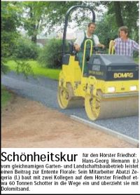 für den Hörster Friedhof: Hans Georg Hemann (r.) vom gleichnamigen Garten und Landschaftsbaubetrieb leistet einen Beitrag zur Entente Florale: Sein Mitarbeiter Abatzi Zeqeria (l.) baut mit zwei Kollegen auf dem Hörster Friedhof etwa 60 Tonnen Schotter in die Wege ein und überzieht sie mit Dolomitsand.