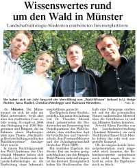 -fz- Münster. Der Münsteraner an sich ist sehr am Wald interessiert, weiß aber über den stadtnahen Forst relativ wenig. So ergab es 2006 eine Befragung von 1500 Bürgerinnen und Bürgern, die im Rahmen eines Studienprojekts zum Thema "Nachhaltige Bewirtschaftung stadtnaher Waldökosysteme" durchgeführt wurde. In einem Nachfolgeprojekt des Wald-Zentrums der Universität Münster haben sich deshalb vier Studierende der Landschaftsökologie an die Erarbeitung einer Informationsplattform gemacht. Das Ergebnis ihres Studienprojekts, das unter der Leitung von Dr. Thorsten Mrosek stand, präsentierten die Studierenden am Donnerstag drei Projektpartnern des Wald-Instituts, dem städtischen Amt für Grünflächen und Umweltschutz, dem Forstamt Münster und der Schutzgemeinschaft Deutscher Wald NRW.