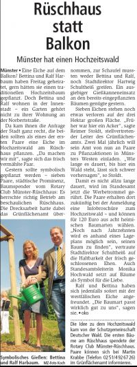 Münster - Eine Eiche auf dem Balkon? Bettina und Ralf Harbaum haben Freitag geheiratet, gern hätten sie einen traditionellen Hochzeitsbaum gepflanzt. Doch Bettina und Ralf wohnen in der Innenstadt - ein Garten gehört nicht zu ihrer Wohnung an der Norbertstraße. Da kam ihnen die Anfrage der Stadt ganz recht, die beiden sollten als eines der ersten Paare eine Eiche im Hochzeitswald am Rüschhaus pflanzen. "Da machen wir mit", sagte sich das frisch vermählte Paar. Gestern sollte symbolisch gepflanzt werden - sieben Paare, städtische Prominenz, Baumspender vom Rotary Club Münster-Rüschhaus: Es herrschte richtig Betrieb am beschaulichen Rüschhaus. Die Drecksarbeit hatte dabei das Grünflächenamt übernommen, zur Schaufel mussten weder Bettina und Ralf, noch Stadtdirektor Hartwig Schultheiß greifen.