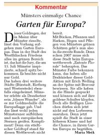 Dieser Goldregen, der in Mainz über Münster rieselte, lässt den Vorhang aufgehen zum Garten Europas. Dass in der Stadt des Westfälischen Friedens alles im grünen Bereich ist, das hat die Jury, die am 13. Juli Münster inspizierte, schnell spitz bekommen.