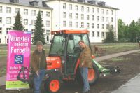 Bis zum Herbst müssen sich die Münsteraner noch gedulden, dann erst wird an der Promenade wieder aufgeforstet. Sponsor Wilhelm Gausepohl (r.) springt in die Bresche und hat Gärtner Ulrich Kleine Bösing (l.) vom städtischen Amt für Grünflächen und Umweltschutz auf den etwa 5000 Quadratmetern vor dem Deutsch-Niederländischen Korps eine Wildblumenwiese einsäen lassen. Die bunten Blumen sollen die Fläche nach dem Sturmschaden für die Dauer der Entente Florale hübscher erscheinen lassen. Auf der doppelt so großen Fläche an der Weseler Straße / Sentmaringer Weg, wo der Orkan genauso gewütet hatte, sät Gausepohl ebenfalls Wildblumen ein.