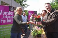 Erst drei kleine Pflänzchen in gelb und weiß, dann noch eine schöne rote Geranie. Joachim Eich aus Gievenbeck freut sich über die blumigen Geschenke seines Vermieters aus charmanten Händen. Carolin Klopsch vom Wohnungsunternehmen ‚Sahle Wohnen’ verteilt gemeinsam mit ihren Kolleginnen und Kollegen bunte Blumen auf dem Gievenbecker Toppheideplatz. Die Mieter der rund 700 Sahle-Wohneinheiten im Toppheideviertel bekommen jeweils vier Pflanzen geschenkt. Zusätzlich können sie weitere Geranien, Petunien und Co. für einen Euro kaufen.