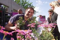 Auch Sahle-Hausmeister Michael Pomplin hat sichtlich Spaß an der Aktion. Er verschenkt mit Vorliebe Männertreu. Mieterin Katrin Ring ist mit ihren drei kleinen Kindern gekommen. Sara, Matti und Marie mit dem roten Fahrradhelm (v.l.) dürfen sich die Pflanzen selbst aussuchen. "Das sind Blumen mit Gute-Laune Garantie", verspricht Adelgund Schmitz, die Leiterin der Regionalverwaltung von Sahle Wohnen. "Wir möchten gemeinsam mit unseren Mietern dazu beitragen, dass Gievenbeck-Toppheide noch stärker als bisher zum Blühen gebracht wird.