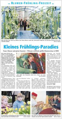 Feuer, Wasser und grüne Daumen – Tillmann eröffnete größte Blumenschau in NRW Von Klaudia Maleska Mit einem Schritt vom Winter in den Frühling gehen – das empfahl Oberbürgermeister Dr. Berthold Tillmann allen Wettermüden bei der gestrigen Eröffnung der „Frühling – Blumen – Freizeit“-Messe (FBF) in der Halle Münsterland. Die anwesenden Gäste werden die Botschaft sicher gern weiter tragen, standen sie doch mitten in einem Meer aus Grün und Blüten, aus Farbkompositionen und Klangeffekten. Applaus bestätigte den Dank Tillmanns an „all die grünen Daumen“, die hier so wunderbar tätig waren.