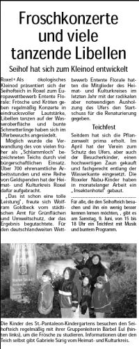 Roxel - Als ökologisches Kleinod präsentiert sich der Seihofteich in Roxel zum Europawettbewerb Entente Florale: Frösche und Kröten geben regelmäßig Konzerte in eindrucksvoller Lautstärke, Libellen tanzen auf der Wasseroberfläche und bunte Schmetterlinge haben sich im Uferbewuchs angesiedelt. Möglich wurde die Verwandlung des von vielen früher als " Schlammloch" bezeichneten Teichs durch viel bürgerschaftlichen Einsatz. Über 700 ehrenamtliche Arbeitsstunden und eine Reihe von Geldspenden hat der Heimat und Kulturkreis Roxel dafür aufgebracht. "Das ist schon eine tolle Leistung" , freute sich Wolfram Goldbeck vom städtischen Amt für Grünflächen und Umweltschutz, der das Ergebnis begutachtete. Für den deutschlandweiten Wettbewerb Entente Florale hatten die Mitglieder des Heimat und Kulturkreises im letzten Jahr mit der radikalen aber notwendigen Ausholzung des Ufers den Startschuss für die Renaturierung gegeben. Seitdem hat sich die Pflanzenwelt prima erholt. Im April hat der Verein zum Schutz des Ufers, aber auch der Besucherkinder, einen hochwertigen Zaun gekauft und fachgerecht entlang der Wasserkante eingesetzt. Die Roxeler NabuKinder haben in monatelanger Arbeit ein "Insektenhotel" gebaut. Für alle, die den Seihofteich besuchen und ihn ein wenig besser kennen lernen möchten, gibt es am Samstag, 9. Juni, von 15 bis 18 Uhr ein Teichfest mit Musik und buntem Programm.